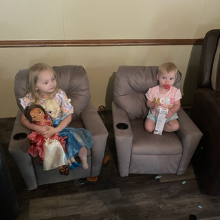 Missy and I got the girls matching recliners last year. Ember is finally big enough for hers so I got it out for her today and she loves it. She was getting to where she wanted to set in ivorys allot so we knew it was time.