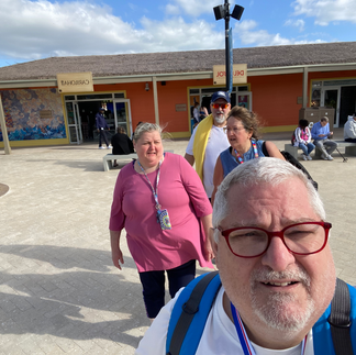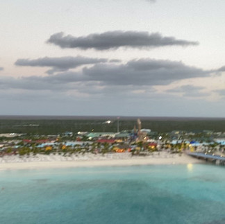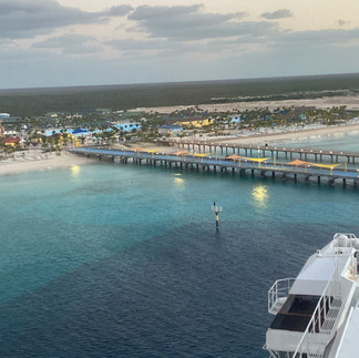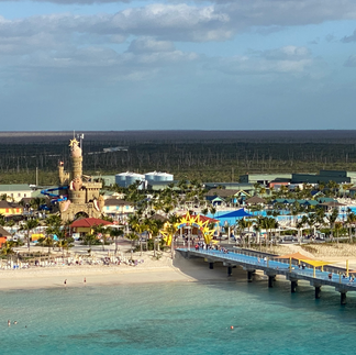 I woke up early around 6:38am to watch us pull into Celebration Keys and it was something. I got dressed and went outside to watch us pull in. You could see the big castle that has the water slides in it standing tall. It really wasn't warm but not as cold as what we left back in Norfolk. Celebration Keys is a new place that Carnival opened up in 2025 for their ships to dock and passengers to have a great time.