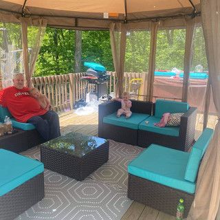 We got a gazebo first of April and never got to use it until the wind blowed it away. We was able to return it to the place of purchase and we got us another one. If this one blows away the whole house will go. Here is our finished project. We had two great helpers.