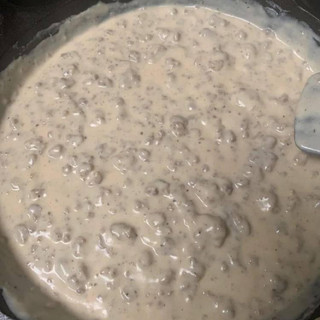 With your finger tear small pieces of sausage and add them in a single layer to a large heavy skillet. Brown the sausage over medium-high heat until no longer pink. Reduce the heat to medium-low. Sprinkle on half the flour and stir so that the sausage soaks it all up, then add more little by little. Stir it around and cook it for another minute or so, then pour in the milk, stirring constantly.